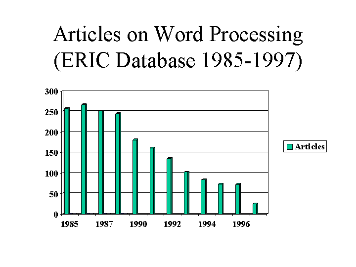 Despite this marked decline in the study of word processing by educational researchers, Susser's thesis is not that word processing dissappeared but rather that it "never appeared in any meaningful sense" (p. 349). According to Susser, "researchers have for the most part ignored the important variable of the level of their participants' skills with word-processing packages" (p. 355). In other words, research has focused on students' general development as writers without examining their interactions with the word processing software (pp. 350-355).