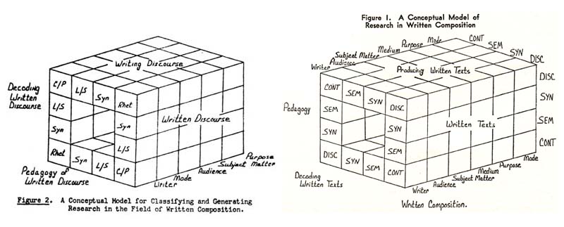 Stephen Witte has been called an "empiricist," but doing so belies the eclectic grasp he had—and had early—of the whole field of composition studies. Consider these two diagrams, constructed a year apart. The first, on the left, illustrated a talk he gave at the Conference for Programs in Technical and Scientific Communication at Oklahoma State University in 1979, a talk he called "Procrustean or Paradigmatic: A Model for Research in Written Composition." The second, on the right, accompanied his 1980 Research in the Teaching of English revision of the talk, "Toward a Model for Research in Written Composition" (pp. 73-81). Both try to image the whole range of topics and questions open to composition research studies. Both insist on a view of the field that is three-dimensional or interdependent or, as Witte put it, "interactive configurally." Differences in the two diagrams show Witte moving toward a conception that is more rather than less complex. Both break the study of written composition into four main components—instruction (pedagogy), process (writing or producing), textuality (written texts), and hermeneutics (decoding)—here pictured as the horizontal plane. But to the features for study—pictured as the vertical right-facing plane—to writer, audience, subject matter, purpose, and mode in the earlier diagram, the later diagram adds a sixth, medium (e.g., newspaper, computer). The largest changes from 1979 to 1980 are in Witte's four main arenas for research questions—the vertical left-facing plane. Syntactic (SYN) and lexical/semantic (L/S or SEM) remain the same, but rhetorical (Rhet) becomes "supersentential structures and operations of discourse" (DISC), and cognitive/psychological (C/P) becomes "situational or cultural context" (CON). The later diagram, even more than the earlier, encourages researchers in composition to go beyond "instructional practice" and "explore new and perhaps uncharted areas" ("Toward a Model," p. 73). Four years later Witte helped usher in the first issue of Written Communication, which for the next twenty years under his co-editorship did more to expand the formal study of written texts into "uncharted areas" than any other professional journal. In the last few years he was researching and writing in areas such as activity theory, material rhetoric, and Vygotskian discourse. One of his last pieces (co-authored with Christina Haas) is "Writing as Embodied Practice: The Case of Engineering Standards," a detailed ethnographic study that appeared in the Journal of Business and Technical Communications (2002). "Empiricist" indeed. To the loss of all of us, this week Stephen Witte passed away. When it came to unmapped terrain, he was always leaving the rest of us a little behind. RH, April 2004 |
