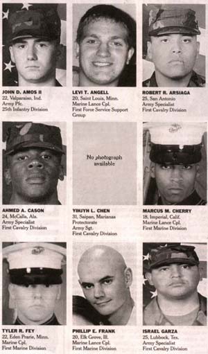 April 15, 2004, A13, full-page display of 64 photographs, two labeled