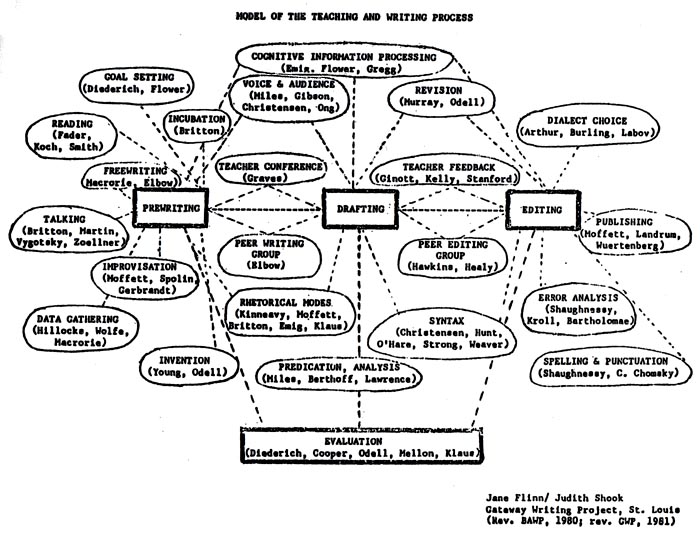 An aerial photograph of "the writing process" as seen by many school and college teachers around 1980. The model, which cites scholarship for each of the nodes in the process of writing and the teaching of writing, appeared as the appendix to Jane Zeni Flinn's "Teacher-tested research on writing." Flinn's piece is the last essay in her edited collection Reflections on Writing: Programs and Strategies from Classrooms K-12, a mimeographed volume produced in 1981 by the English Department at the University of Missouri-St. Louis. Although the isolation of the steps in the writing process had already been challenged, indeed by some of the scholarship cited in this model/bibliography, Flinn's essay follows the chart and omits any suggestion of nonlinearity or recursiveness. The "Gateway Writing Project," mentioned at the bottom and co-directed by Flinn, was the St. Louis branch of the National Writing Project and therefore would trace its genealogy back to James Gray's founding Bay Area Writing Project (hence the attributions of "BAWP" and "GWP"). This helps explain why many of citations in the model would have been more familiar to school teachers than to college teachers. Some references less easy to trace are Haim G. Ginott, Teacher and Child: A Book for Parents and Teachers (1972); Carl H. Klaus, Composing Childhood Experience: An Approach to Writing and Learning in the Elementary Grades (1979); Kenneth Koch, Wishes, Lies and Dreams: Teaching Children to Write Poetry (1970); Roger Landrum, A Day Dream I Had at Night and Other Stories: Teaching Children to Make Their Own Readers (1971); Frank Smith, Writing and the Writer (1981); Viola Spolin, Improvisation for the Theatre: A Handbook of Teaching and Directing Techniques (1973); Tom Wolfe, The New Journalism (1973), Jacque Wuertenberg; Helping Children to Become Writers (1980). CompPile should be sufficient to find the others. Or you can go to Flinn's own bibliography, available along with this diagram and the rest of the edited collection, at ERIC Document Reproduction Service, ED 262 421. It's all indexed in CompPile. The same year the co-author of the diagram, Judith Shook, published a note in Research in the Teaching of English with data arguing that the students of St. Louis school teachers who had attended the Gateway Writing Project's summer workshop subsequently gained more in their writing skills than did students of teachers who had not attended ("The Gateway Writing Project: An Evaluation of Teachers Teaching Teachers to Write," Volume 15, No. 3, 1981, pp. 282-284). Shook doesn't say whether the Gateway Writing Project teachers had read all the works cited in her and Flinn's diagram. RH, May 2004 |