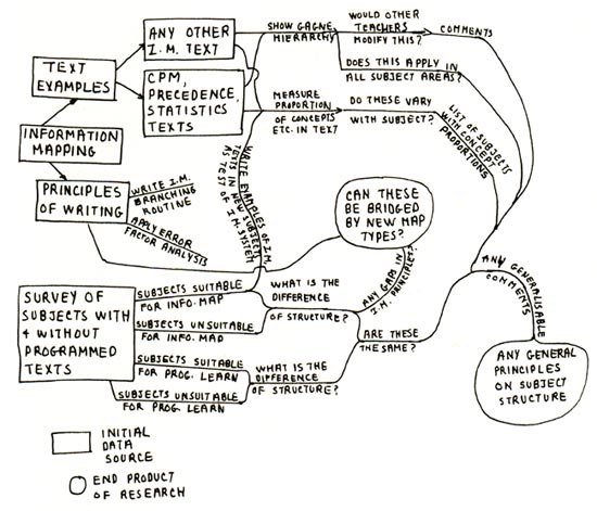 My last example prefigures hypertext even more clearly. This is an illustration of "pattern mapping" or "pattern notes," published by Alan Fields in 1982. Pattern notes is a method of inventional pre-writing that Fields recommends to technical writers. "Pattern notes exploit the fact that our mind jumps from point to point in a non-linear manner as we think about ideas for a topic" (p. 33). The figure shows his own pattern mapping for the summary section of a research proposal. Note that though the end text would have been written in a conventional "linear" fashion, this synopsis of the exposition is heavily recursive. In figuring out Fields' summary, the reader can begin anywhere and move in several directions. Fields' nonlinear invention technique was not radically new in 1982, of course. For decades now, issue trees, hub and spokes, writing wheels, idea clustering, topic branching, topic mapping, word associations, and many other pictorial strategies have been proposed by writing teachers to break down the kind of linear thinking that often impoverishes a topic before it is turned into a sequence of words, sentences, and paragraphs. Word by word, sentence by sentence, paragraph by paragraph may be the order that convention imposes on printed text, but, as Stevens would say, that order is a fiction since they occur there spatially and temporally all at once. It is certainly a fiction to think that readers actually process a piece of prose in that order, no matter how conventional the text. Eye-tracking studies have been active since the 1930's, and saccades, scanpaths, and fixation positions, when mapped, show that human cognitive processing is never linear though the text or picture may appear to be. The brain was hypertexted before computers were, a fact that writers have known and used for centuries. These four examples of "non-linear" discourse may be odd but they are not transgressive of "conventional" modes of discourse. Yet the myth that hypertext radically breaks linear print persists. In 2002, virtually all of Jean Mason's informants proposed "non-linearity" as the one element that most differentiates hypertext from printed text. Significantly, Mason's point is made in an e-book, whose index, with multiple entry points and many interconnections, is remarkably similar to Fields' pattern notes.