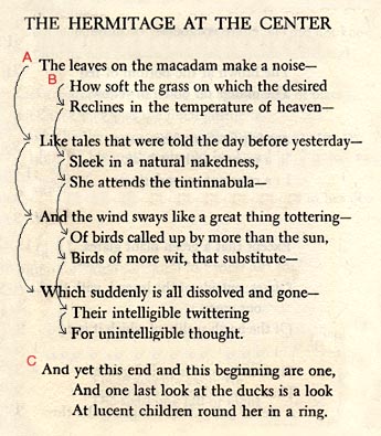 | Or consider this poem by Wallace Stevens, "Hermitage at the Center," published in 1954. The poem consists of three sentences. The first two, which start respectively at line one and line two, are interwoven so that they both conclude at the end of the fourth stanza with a shared full stop. It is possible to read the lines sequentially, with the second sentence treated as a parenthetical thought periodically taken up and set aside, but that requires a short-term memory capacity that I, for one, do not have. With arrows I have indicated the path my eye takes in reading this poem. I begin at point A, return to point B, and then regather at point C and finish. This nonlinear eyepath reflects the nonlinear movement of consciousness reenacted by the poem. The observer of the ducks ("one last look") is aware of two things at once, the fall weather and the mother duck and her ducklings, the end of summer and the beginning of a family—and then has the insight that "this end and this beginning are one." The park (probably Elizabeth Park in Hartford, Connecticut, where Stevens liked to retreat from the noise of the city) is both the locale and the symbol of a field where season, animals, and humans ("Birds of more wit") form an interpenetrating whole. The experience is a "ring" that a straight line, whose end and beginning are not one, would belie. Poems, they say, are written to be read aloud. But not all poems. Reading aloud enforces a linear path that erases the many ways poets over the ages have encouraged nonlinear readings, with refrains, interlaced rhyme and metaphor schemes, picture shapes, acrostics formed of the first letter of each line (see CompPanel 40), and many other techniques. Nonlinearity in poetry is very common. You may think the dovetailing of lines in "The Hermitage at the Center" is eccentric, but I have run across the same trick in May Swenson, Robert Creeley ("Le Fou"), Gary Snyder ("Burning"), and Pierre Reverdy ("Perspective"). |