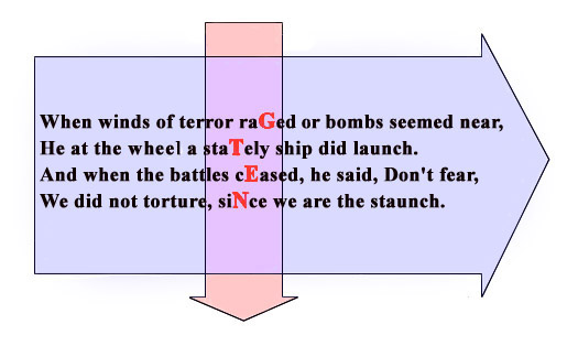 This is gratifying, since you are George Tenet and not a connoisseur of poetry, but since you are George Tenet and ex-director of the CIA, you run the sonnet through computer cryptography software designed to search text for hidden messages. With no hesitation the software reports back that there is indeed a coded message. Isolating the central letter of each line (disregarding spaces and punctuation) and moving from the first to the fourteenth line (this is a sonnet, remember), the poem spells out G-T-E-N-E-T-T-O-R-T-U-R-E-R. The poem is an acrostic. More exactly it is a kind of acrostic called a mesostich (or mesostic), which forms words out of the middle letter of lines. Since in English the subtext of an acrostic runs downward in contrast to the text which runs rightward, part of the effect is graphic.