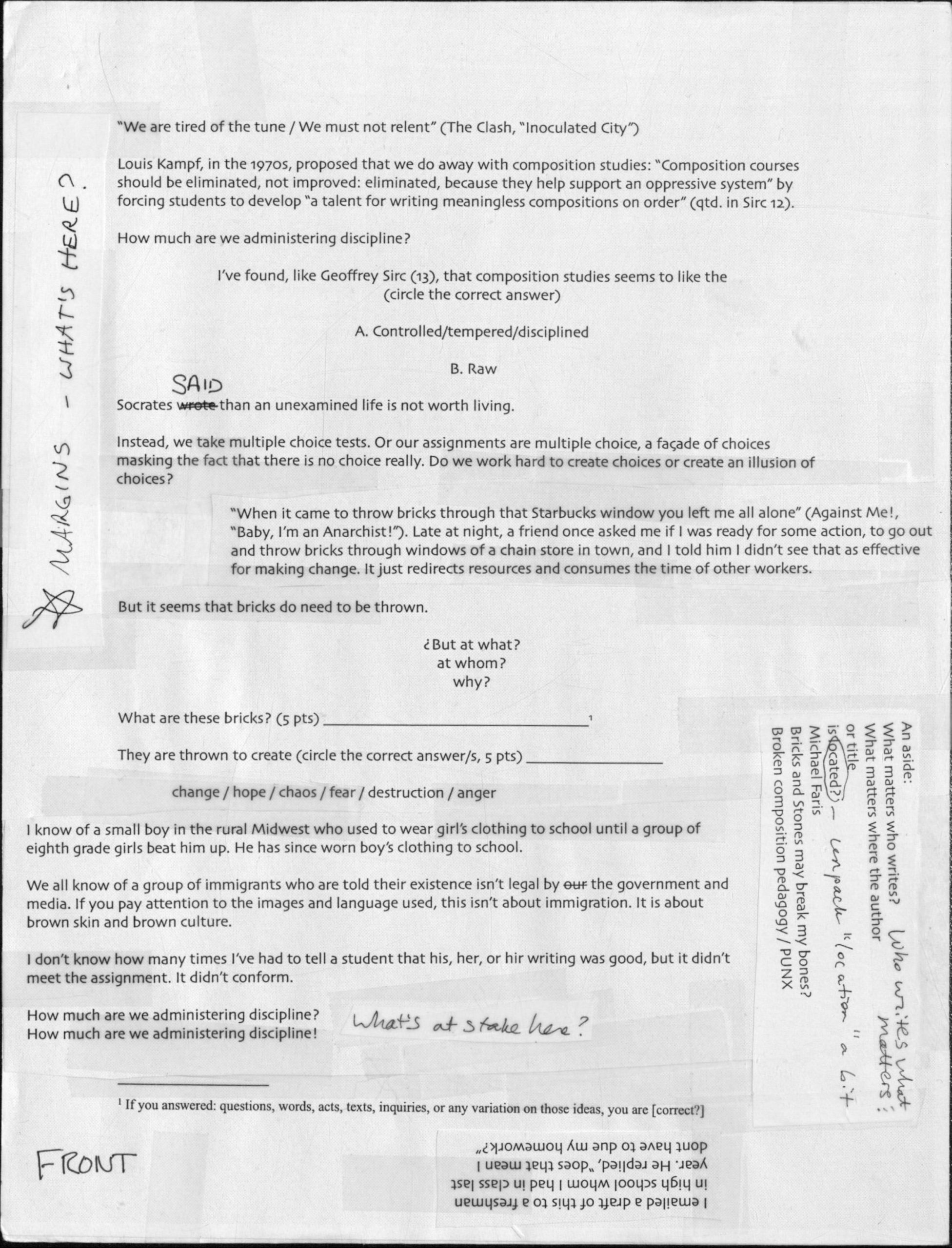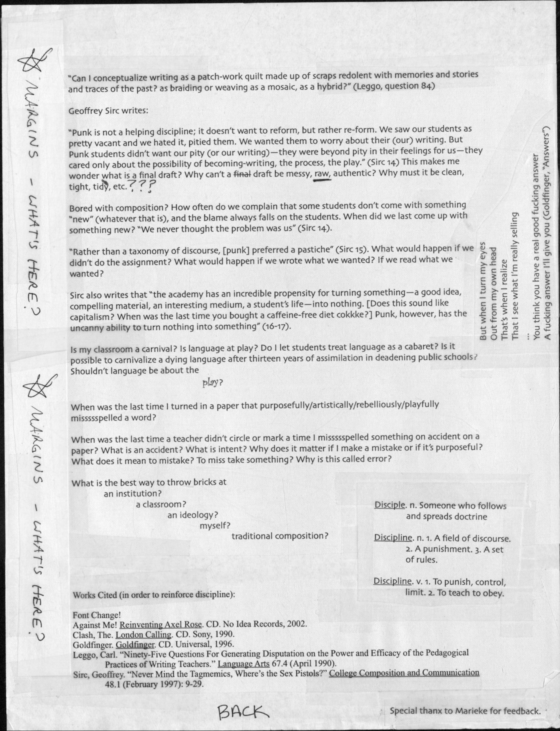 My I-Search Essay for Lisa’s composition theory class was inspired by Geoffrey Sirc’s “Never Mind the Tagmemics,” a queer and anti-racist desire for social justice and change, and punk aesthetics and music. Rather than a traditional essay, I created a collage, cut-and-pasted together with scissors and tape like a zine. I included quotations from Sirc and punk lyrics, and I photocopied and taped on handwritten comments from my classmate Marieke, who had provided me feedback on a previous draft.