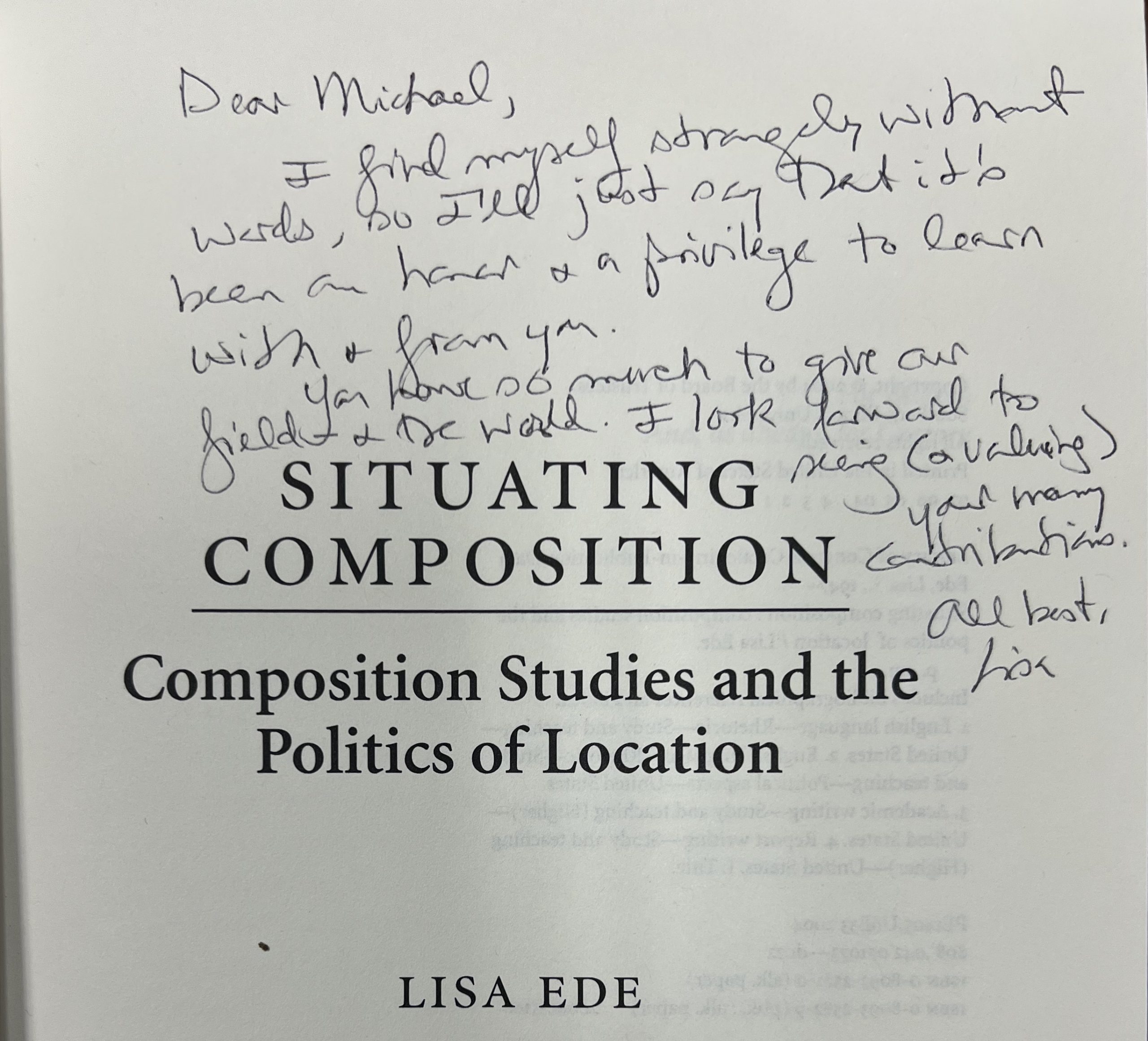 Figure 3. Lisa’s 2007 inscription in my copy of Situating Composition. I share this because I find Lisa’s handwriting so beautiful. In 1990, my third-grade teacher told my class that someone in the Talented and Gifted program had such messy handwriting that they didn’t belong in the program. I don’t know for sure, but I think she was talking about me. When I look at Lisa’s handwriting, I’m reminded of Lisa’s immense love but also how her scholarship and teaching challenged the norms of literacy, like the one my third-grade teacher reinforced. Lisa’s handwriting is difficult for me to decipher but also incredibly beautiful. I feel all sorts of pleasure in how my third-grade teacher would read Lisa’s writing as “messy.” Image description: the title page of Situating Composition with Lisa’s note: “Dear Michael, I find myself strangely without words, so I’ll just say that it’s been an honor and a privilege to learn with & from you. You have so much to give our field & the world. I look forward to seeing (& valuing) your many contributions. All best, Lisa.”