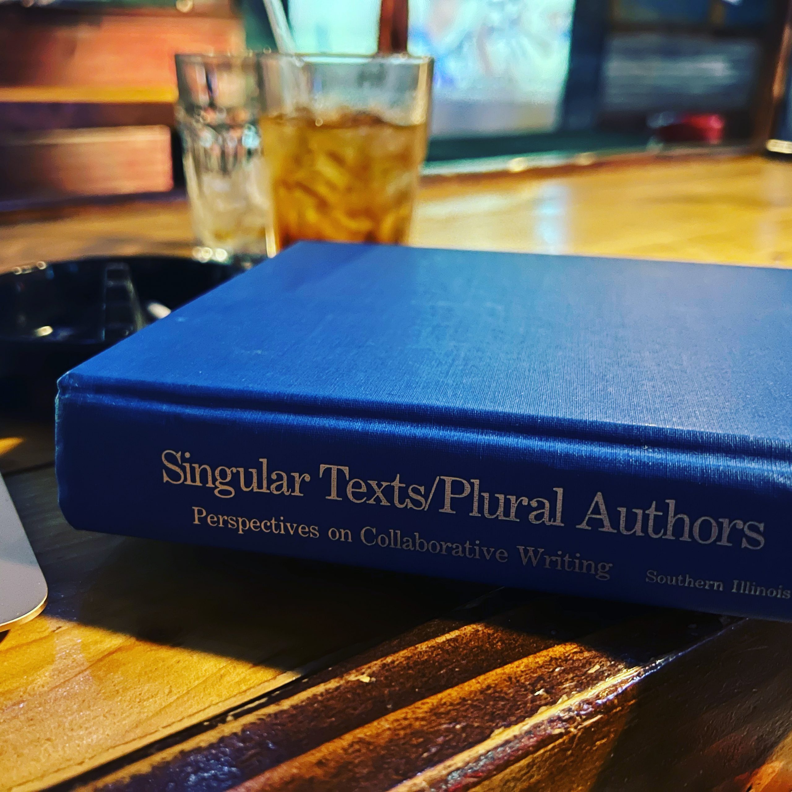 Figure 4. Workspace at the bar: Reading Lisa and Andrea’s book and writing this essay with a whiskey and coke. Image description: a close-up of the spine of the book Singular Texts/Plural Authors, its solid blue cover without a dust jacket. The book is placed on a polished wood bar. Just behind the book, out of focus, is a black ashtray and two drinks: one whiskey and coke and the other empty, finished, except ice.