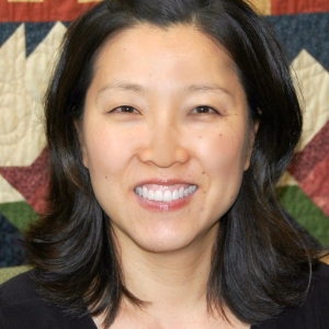 figure 1: a close-up headshot of Hyoejin Yoon smiling and looking at the camera. She is wearing a black blouse and is in front of a quilt that is hanging on a wall.