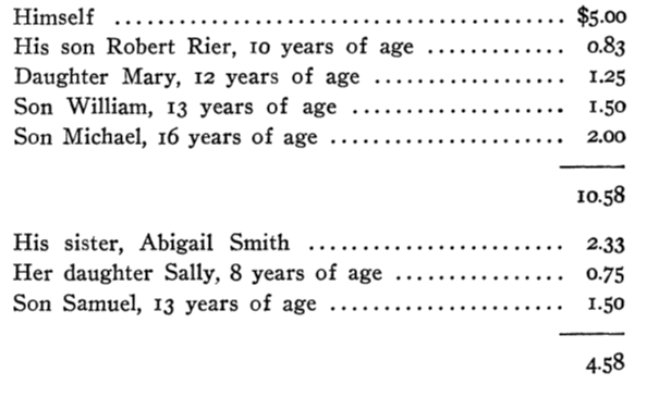 Figure 2: Compensation from the Family System (Abbot 28) Image description: a written table of salaries for each member of a family. One section of the table is a list of salaries of a man and his children. The family members’ names, ages, and relations are written on the left side of each line, and a series of dots separates the person from the salary amount. The top section reads: Himself $5.00, His son Robert Rier, 10 years of age 0.83, Daughter Mary, 12 years of age 1.25, Son William, 13 years of age 1.50, Son Michael, 16 years of age 2.00. Underneath Michael’s salary is a line and the total for the family, 10.58. The bottom section reads: His sister, Abigail Smith 2.33, Her daughter Sally, 8 years of age 0.75, Son Samuel, 13 years of age 1.50. Underneath Samuel’s salary is a line and the total for Abigail and her children: 4.58.