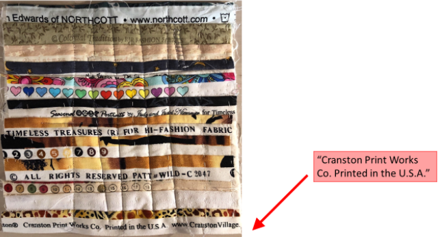 Figure 1: 7×7 Quilted Selvedge Square Made from 12 Fabric Selvedges. Image description: a square of fabric selvedge strips. The strips are neutral colors (white, tan, beige, black) on top, with a colorful print strip toward the middle containing a line of 14 hearts, each in a color from the print, and more neutral selvedge strips in the bottom half in animal print. The lines of text on the selvedges read (from top to bottom) “Edwards of NORTHCOTT www.northcott.com,” “Timeless Treasures ® For Hi-Fashion Fabric,” “© All Rights Reserved PATT # WILD-C 2047,” and “Cranston Print Works Co. Printed in the U.S.A. www.cranstonvillage.” The rest of the URL is cut in order to fit the square