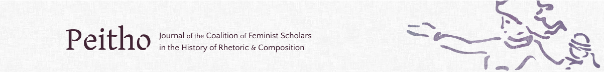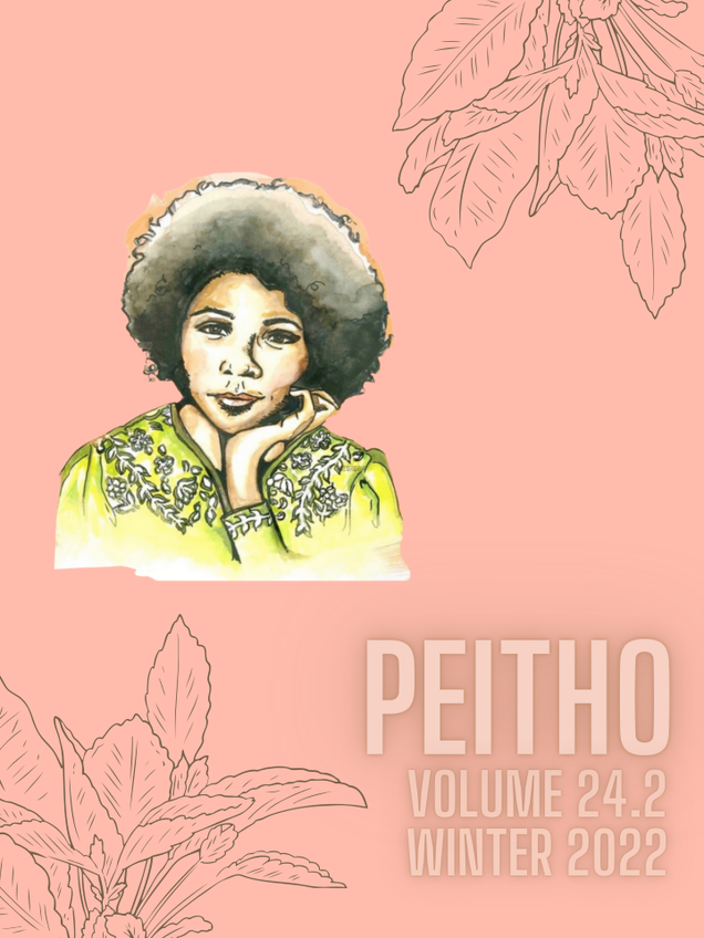 Cover description: a light orange-pink color background with line drawings of leafy plants on the bottom left and top right corners. Inset in the left side of the image is a drawing based on a close-up photograph of bell hooks. She is wearing a yellow long-sleeved blouse with embroidery around the neckline and around the cuff. She is resting her chin on her left hand and has a thoughtful facial expression. In the lower right corner are the words “Peitho Volume 24.2 Winter 2022.” The drawing of hooks is by Angélica Becerra, an artist and postdoctoral teaching fellow at Washington State University, and is used with permission. Her art is available for purchase here: https://angelicabecerra.store/