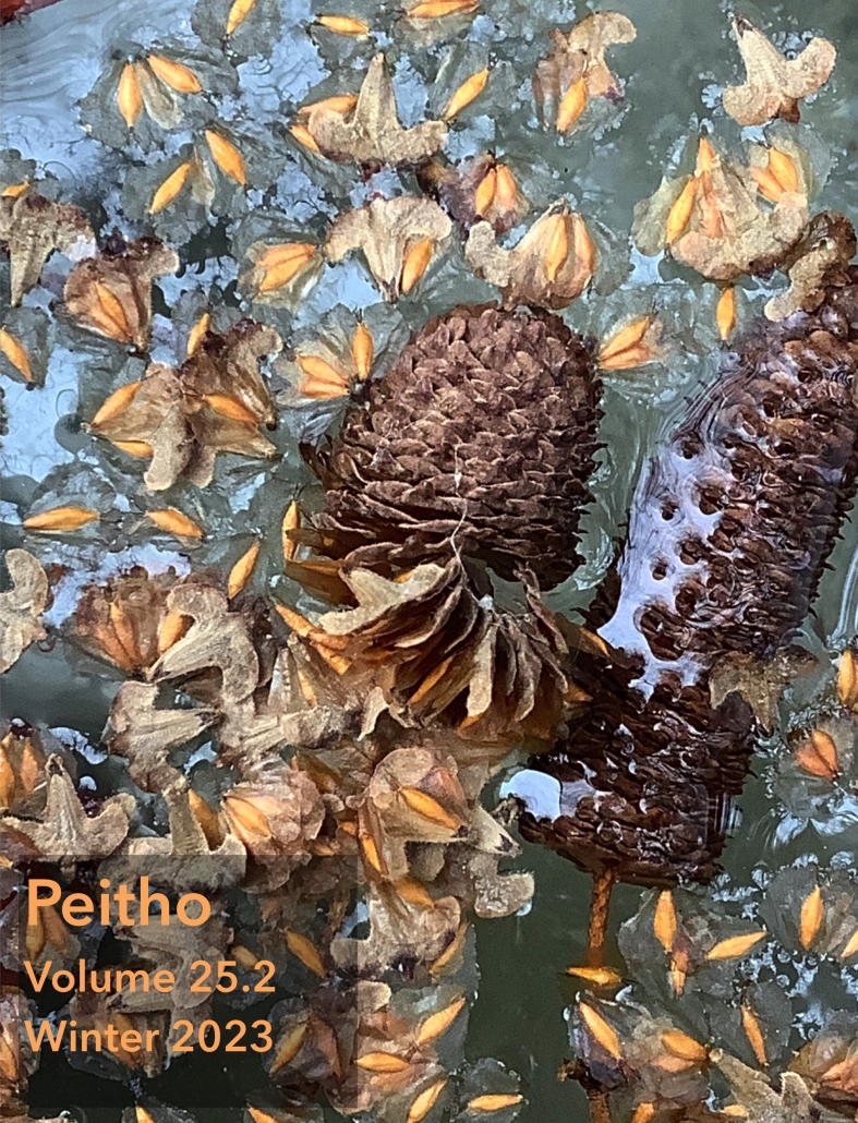 Cover Art: Image description: a close-up photograph of seed cones and fallen leaves in shades of light brown and light orange on the frozen surface of water. In the lower left corner is a transparent black rectangle with the words Peitho Volume 25.2 Winter 2023