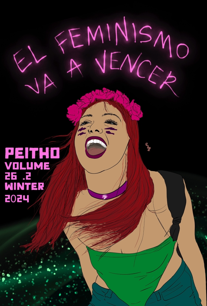 Cover Art: Image description: a drawing by Pilar Emitxin. A young woman leans forward, laughing or shouting gleefully. The background is black, and bright pink text reads: “EL FEMINISMO VA A VENCER” (“Feminism is going to win”).