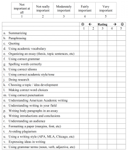 After developing this inventory, I created a survey (see Appendix A) asking participants to rate the relative importance of each sub-skill on a scale from 1 (not important at all) to 5 (very important). I used the following statement to solicit their responses: “Writing center tutors are not always able to address all aspects of writing in a single visit. So of the topics and skills listed below, which do you think are the most important for tutors to help with?” The survey listed sub-skills in random order rather than grouping them by informant role, which meant that respondents were unaware of the informant role classifications. Each sub-skill was listed concisely without definition or elaboration. Participants rated each sub-skill individually rather than rank-ordering them all.