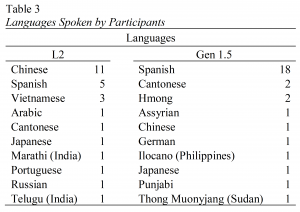 Of the L2 writers, 10 different native languages were represented, almost all of which were Asian. The Gen 1.5 group also represented 10 different languages, of which the majority spoke Spanish (see Table 3 for more details). Additionally, L2 writers were older on average than L1 or Gen 1.5 writers.