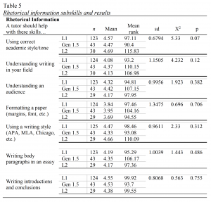 The results in Table 5 show that there was no statistically significant difference in participant responses among all seven rhetorical information sub-skills. The first item, about academic style/tone, approached significance, with a p-value of .07. The lack of significant difference within rhetorical information may be explained in at least two ways. It may be that the items were worded in such a way that they did not distinguish L1 needs from those of Gen 1.5 or L2 writers. For example, the rhetorical information described in the survey may have been too general while the rhetorical information that L2 writers particularly need may be much narrower, such as help knowing how to write persuasive appeals in English. Another possible explanation, however, is that L1 writers felt just as much of a need for rhetorical information as multilingual writers. In other words, L1 writers may have felt that their “lifetime of exposure to the . . . rhetorical structures . . . of writing in English” (Reid & Powers, 1993, p. 26) failed to provide them sufficient insights to warrant skipping rhetorical instruction in a writing center tutorial. Alternatively, it may be that writers, irrespective of language background, had been conditioned to think rhetorically thanks to an emphasis on audience needs/expectations in academic writing and composition pedagogy. Repeat attendees of the writing center might especially have been socialized into actively considering the rhetorical impact of their writing and thus seek that help.