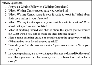 For example, we recall waiting in a Writing Center’s lobby at the University of Rochester, listening to a conversation between two Writing Fellows (undergraduate peer writing tutors at the University of Rochester) from the opposite end of the hallway. A potential tutee looking for help walked in the door and heard the chatter. She hesitated, concerned that there was no tutor available in what sounded to all of us like a busy office, until another tutee walked straight through the lobby space and down the hall. Confused, the rest of us followed the other tutee and found the Writing Fellows casually talking, available to help tutees. They laughed and apologized for the conundrum; while we had waited in the lobby, the tutors had been waiting for a tutee to come back down the hallway for a session.
