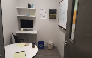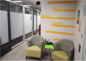 To describe the unique dynamic of interactions between tutor and tutee that stem from the different roles of these two parties in a tutoring session, we use the term “interface.” It functions as an indication of the power dynamics that dictate a writing session. Tutors and tutees do not truly sit down as equals. The fact that tutors hold power over the development of a session is evident in that they are available for a specific, limited, and productive purpose. As this purpose is carried out to completion, so the tutor-tutee relationship ceases (Handbook, 2014-2015). This term considers the power dynamics and distance between Writing Centers’ parties as a feature of the writing session, which lends itself well to describing the Writing Center’s spatial effects on the tutor-tutee relationship and their interactions. Condensing this dynamic into a single term offers a shortcut to understanding a writing session that allows us to emphasize the effects of space on that session.