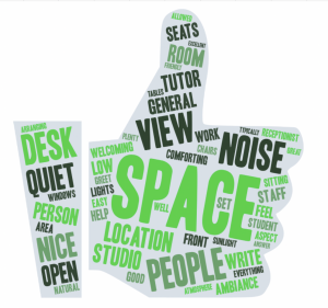 Figure 13. Considering space, location, general ambiance, noise level, etc., what aspects in the studio were welcoming. This word cloud shows the most common words students used in their responses to this question.