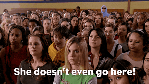 Figure 1. A GIF of a man in a hoodie and sunglasses behind a group of women. Includes the text “She doesn’t even go here!” From Mean Girls by L. Michaels, T. Shimkin (Producers) & M. Waters (Director), 2004. [Motion Picture]. United States: Paramount Pictures. Copyright 2004 by Paramount Pictures.