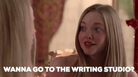 Figure 18. A GIF of an excited girl with the text “Wanna go to the writing studio?” Carter, J., & Dean, K. (2018). [Image of character from L. Michaels, T. Shimkin (Producers) & M. Waters (Director) Mean Girls (2004) with the text “Wanna go to the writing studio?”]. Image retrieved from https://www.youtube.com/watch?v=N0PpEoKHlO0. Copyright 2004 by Paramount Pictures.