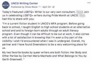 The second social media initiative, directed at LGBTQ+ writers, has proven more successful. In Spring 2017, a trans undergraduate friend texted Olivia to ask if it would be safe to bring a paper about trans issues that outed himself into the writing center. This initiative was designed to signal “welcome” to writers such as her friend ahead of time, so that questions like his would no longer be necessary. Accordingly, our sign-in form has also been changed to add a parenthetical explaining that we do not need the writer’s legal first name—only what they want us to call them. Olivia leveraged Leia’s quote posters for LGBTQ+ writers by reposting the writers’ faces and associated quotes on the writing center’s Facebook and Twitter pages along with additional biographical information about the writers, presenting this series of featured writers as part of “Pride Month at UNCG,” a campus-wide event. At the end of March, when the campus-wide programming began, Olivia shared a post on Facebook and Twitter, adapted slightly for each platform, shown in Figure 4.