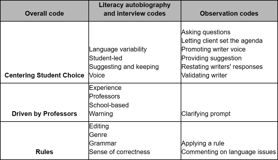 I used a two-cycle coding process for analyzing the data I collected. First, I inductively created a codebook for the literacy autobiographies and interviews. I created a second codebook for the observations, as I wanted to target the second research question with the observations, and this allowed me to code in a way that better captured the actual actions tutors took in writing center sessions. I refined these codebooks in second cycle coding and created a third codebook which connected the conceptualizations of academic writing and language gathered from the literacy autobiographies and interviews with the actions taken in tutoring sessions. That codebook is below.