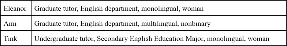 I had 3 participating tutors in this pilot project: Eleanor, Ami, and Tink.[3] All three tutors identified as white and English-speaking. All three tutors were selected because they were in their first semester as writing center tutors, having just completed their tutor education course the previous semester. The tutor education course covered linguistic justice across two class meetings, focusing on the key concepts of working with multilingual writers, using inclusive language, and challenging WME in academic writing. This brief education allowed tutors to have an understanding of what language ideologies are and a vocabulary for expressing their beliefs regarding language use in academia, which made the selection of these tutors reasonable for answering my research question. More information about each participant can be found in Fig. 3.